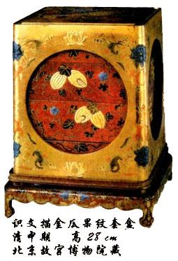 在坤集里,黄成对漆器的分类有14种,我们简单了解一下。比如有"质色门",就是单色漆器,像黑漆、朱漆这两个基本颜色;比如有"描饰门",说得很清楚,就是带画工的;"填嵌门",带镶嵌的;"雕镂门",动刀装饰的;再有"阳识门",阳,指的是凸起,像我们马上要说的识文描金,就属这一类。今天很少用"门"来分类,一般都说什么类,不说什么门。其实门就是指门类,过去说分门别类、五花八门,都是分类的意思。那么,《髹饰录》里这14种分类,今天看不一定很科学,属于一家之言,但能看出来,在明代中国的漆器已经非常丰富了。