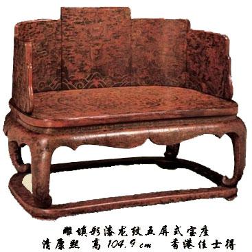 跨过明就是清,清代以后漆器的门类繁多,工艺水平大幅提升,大件漆器的数量增多。今天能看到的大件清代漆器,除了屏风以外,还有宝座。2007年5月,香港佳士得拍卖一件康熙时期的云龙纹漆宝座,尺寸非常大,康熙时期的标准龙纹,拍了1376万元港币。这件漆宝座从古家具的角度上讲,跟紫檀宝座价格相差无几,可见社会对漆器的认识不低于对紫檀的认识。