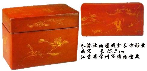 此外,宋代红漆戗金的漆器非常流行,在红色的漆器上用针或锥等利器先画出图案,再涂上金粉。虽然当时这种戗金漆器也属于高档漆器,但它非常世俗化。它不是宫廷所用,而是民间所用。比如上面常出现的沽酒图、花卉图,都符合宋代人的大众审美。
