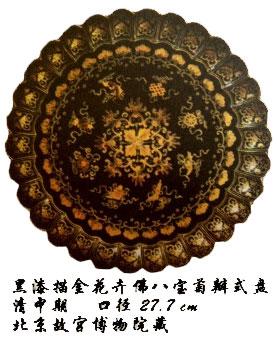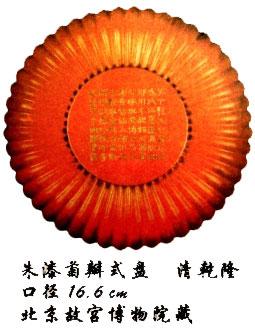 漆的本色是黑红两色,这对清代的漆器依然有根深蒂固的影响。清代到了雍正时期,非常愿意在漆器上描金,有黑漆描金、朱漆描金、识文描金。比如雍正时期的朱漆菊瓣碗或菊瓣盘,单色,中间描金,和雍正时期的瓷器样子非常相似。黑漆描金和朱漆描金都很好理解,那什么是"识文描金"呢?识文描金的"识",准确的念法应该念"制",我们常说的一个词是"款识"。何为"款识"?低于平面的为"款",高于平面的为"识";也就是说凸起来的为"识",陷下去的为"款"。"文",指纹饰。识文描金,说的就是在纹饰凸起来的地方描金,是漆器中极为奢侈的工艺。识文描金是一种极为特殊的漆器。你想,在凸起来的地方描金一定好看,它是立体的。