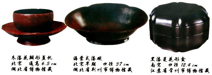 宋墓中出土的漆器造型多样,有花口碗、花口碟、海棠形碗等等,跟当时的瓷器非常接近,宋瓷中也有花口碗、海棠形碗。那么,我讲瓷器的时候讲过,宋瓷中有紫定、红耀州,都是紫褐色的瓷器,这种紫褐色瓷器其实就是深受漆器的影响。贵族使用漆器表明自己的社会地位,那么这种仿漆器效果的瓷器也算是一种比较高档的瓷器。