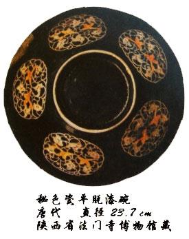 我们现在要强调一个"胎"的概念,漆不能单独成形,一定要依附在一个介质上,这个介质就是胎。我们最熟悉的首先是木胎,大部分漆器都是木胎的,此外还有竹胎、皮胎、金属胎,甚至玻璃、陶瓷这种材料都可以作为胎。过去有锡胎的漆器,一拿特别沉,就是因为里面是锡胎。再比如瓷胎,唐代出土的一个最著名的瓷胎漆器是陕西法门寺出土的,用秘色瓷做胎。我们知道,秘色瓷都是国宝,漆器用秘色瓷做胎,非常奢侈,可见其名贵。这件瓷胎漆器是一只碗,里面是秘色瓷,看得清清楚楚,外面平脱金银。平脱属于镶嵌工艺,在后面会讲到。