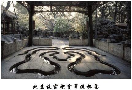 乾隆皇帝对此事也非常欣赏,所以他在故宫的乾隆花园里修了一座禊赏亭,亭子里象征性地挖了一个转来转去的小水渠,叫做流杯渠。但乾隆的这个意思跟最开始兰亭的意思就差远了。你想,人家原来是条天生的小河道,乾隆却在石头上凿出一个槽。估计乾隆当年也在槽里搁一杯子,自个儿坐在那头儿等它过来,再做首诗,诗也是头天晚上做好的。