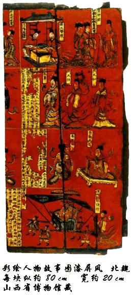 到了北魏时期,最著名的漆器就是山西大同司马金龙墓出土的漆屏风。漆屏风的主色调为红色,上有彩绘,用黄、白、青、绿、橙等颜色绘有很多历史人物故事,比如帝王将相、烈女孝子等等。有学者认为这些彩绘是用核桃油来调制颜色的。《北齐书·祖传》中记载:"善为胡桃油以涂画。"祖善于用核桃油调制颜色来画画。我们都知道,山西的吕梁山、太行山地区都盛产核桃,所以这种说法顺理成章。一个文物在历史上能够出现,一定跟它所处的环境有关。