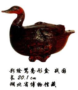 我们熟知的湖北曾侯乙墓,出土过一件鸳鸯盒,黑红两色漆。鸳鸯,在我们的民族文化中代表爱情,早在《诗经》里就有描述。唐代诗人卢照邻也有相关的诗句:"得成比目何辞死,愿做鸳鸯不羡仙。"在战国时期就有这样造型优美的容器,含义非常美好。一个鸳鸯形的漆盒摆在案头,它可能是女主人的礼物,也可能是男主人送给女主人的心爱之物。