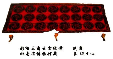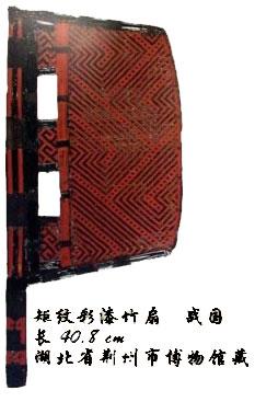 在战国到汉的这个时期,漆器工艺已经非常成熟了。比如湖北江陵出土过战国的矩纹彩漆竹扇,漆扇是半边的,呈菜刀状。现在想象这种扇子不是很容易,因为都是自己给自己扇扇子,菜刀形的扇子是别人给你扇。今天都很难看到扇子了,以前人人手里拿着一把大蒲扇,我小时候还给我爹扇过呢。那么,这把菜刀形的漆扇上面明显可以看出编织的痕迹,是事先刷的黑红两色的漆,再编结成一把扇子,非常精致。