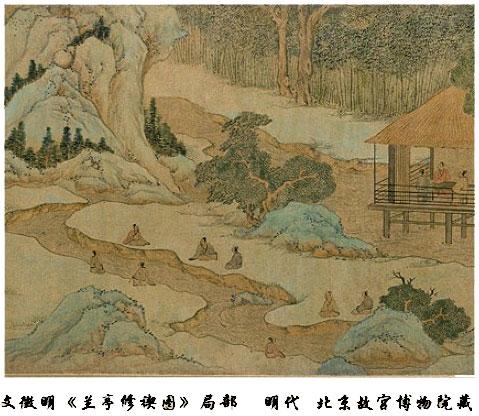 更著名的一个故事是曲水流觞,对中国文化有点儿了解的人都知道这个故事。王羲之的《兰亭集序》里清晰地记录了当时的盛况,文人雅集,几十个人聚在一起。他是这么写的:"永和九年,岁在癸丑,暮春之初,会于会稽山阴之兰亭,修禊事也。群贤毕至,少长咸集。此地有崇山峻岭,茂林修竹,又有清流激湍,映带左右,引以为流觞曲水,列坐其次。虽无丝竹管弦之盛,一觞一咏,亦足以畅叙幽情。"这是王羲之的《兰亭集序》,只要是练书法的人,都知道这个名帖。