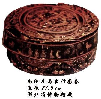 有人可能会举出反证:湖北出土的战国车马出行图奁上的就是彩漆。错了!车马出行图奁上确实发现有很多彩,但这个彩一看就不是漆,它没有光泽。这种只能定义为彩绘,而非彩漆。从技术层面上讲,这不是用漆调的彩,而是用油调的彩,当时还没有办法把颜色均匀地溶入漆里。今天老百姓都说"油漆",没有人单独说"漆";可历史上油是油,漆是漆。我们能够见到的早期带彩的漆器,彩都是用油调出来的,不是漆调出来的,不能称为彩漆。