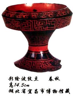 到了春秋时期,漆器就已经非常完美了。比如1988年湖北当阳县出土了黑红色漆的波纹豆。当时很多漆器都跟青铜器的造型非常接近,有的几乎一模一样,它们是同等级的艺术品,或者说是同等级的陈设品。战国则是漆器突飞猛进的一个时期,这一直持续到汉。一般来说,今天能够见到的早期完美的漆器,大部分都出自战国到汉这个时期。
