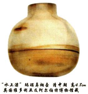 玛瑙壶可以掏得非常的薄,薄到什么程度呢?薄到水上漂,扔到水里就是漂着的。清道光有个人叫沈预,他在《秋阴杂记》中这样记载:鼻烟壶起于本朝,其始止行八旗并士大夫,近日贩夫牧竖无不握此壶。” 这一段记载很明确,到了清代的中期偏晚的时候,鼻烟壶已经风靡全国。我们下一讲接着讲鼻烟壶的其它几个门类。