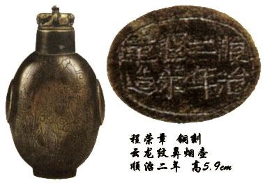我们通过顺治鼻烟壶的这个排队,就有这样一个感悟:当对一件文物不甚了解的时候,不能妄下结论。我们必须通过文物标型学的特征排队,横向比较用证据来说话。我后来就碰见过若干个铜制鼻烟壶程荣章造的陆续买过好几个,当时都非常便宜。这些年已经被社会被世界公认的这是中国最早的鼻烟壶,所以价格也一直在攀升。