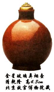 这里提供了一些信息,比如装鼻烟的金镶双扣金星玻璃的扁盒,金星玻璃是什么呢?乾隆朝一种时髦的玻璃器,红褐色,里面闪着金星,又称"温都里那石"。听着就是个外来的名字,很怪。温都里那石在乾隆六年的时候就出现了,一般的史籍是这样记载,仅乾隆一朝有。故宫里现存"温都里那石"就是金星玻璃的器皿大概40多件,数量不是很多。