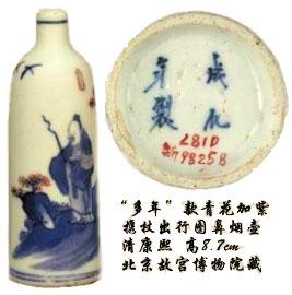 在鼻烟壶的使用当中很多和炫耀的是一种极为特殊的情况。比如康熙时期有一种瓷鼻烟壶叫"多年儿"。我第一次听见也不知道啥意思,我就问,什么叫做多年儿?就是底下写的这个款识一般都写成化年制,这个年字写得非常草,猛一看像多字,所以就形成了一种叫多年款鼻烟壶。就是这年字写的像多字。其实是把这个字写坏了,写歪了写成畸形了。我们过去讲审美的时候讲过,一旦这种畸形的病态的美被推广出去的时候它就会风靡。