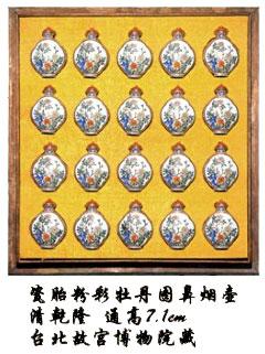 先从陶瓷类讲起。《大清会典事例》记载:乾隆、嘉庆乃至同治、光绪,清室赏赐各国国王及使节的礼单中,瓷鼻烟壶几乎是必备品。乾隆、嘉庆时期,宫廷大量烧造瓷鼻烟壶,然后装盒,一盒有十个或二十个,都是作为礼品备用。这种成盒的鼻烟壶绝大部分都保留在台北故宫博物院,内容有锦上添花、福庆如意、岁岁平安、富贵牡丹等等,非常漂亮。陶瓷类鼻烟壶式样最多的有两种,一种就叫背壶式,又叫荷包扁,是鼻烟壶最早的形状,在清档的记载中往往都有这个名字。另外一种叫爆竹式,也叫筒子瓶,上下一边粗。