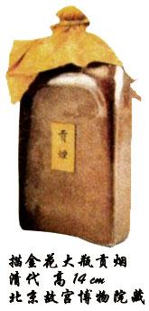 西方人把鼻烟进贡给万历皇帝的时候是装入一个瓶装的容器中。玻璃瓶里头装着鼻烟直接进贡。他这个包装有大小两种包装,大包装一般可以装两斤,小包装一般都是半斤。这种玻璃瓶一般是方的,有大的有小的上面描着金花,玻璃瓶描金。我们今天看西方有很多酒瓶子上还保留这种风格,就是透明的玻璃瓶上描金。所以这叫鼻烟瓶,俗称大金花、小金花。这是鼻烟第一次进入中国时候的状况。