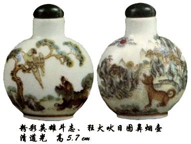 再有呢我们见过道光时期的鼻烟壶,正面画英雄斗志,背面画什么呢?狂犬吠日,画一狗冲着天上一个太阳使劲儿的叫。英雄斗志呢表明了人的一个远大志向。狂犬吠日就是小人得志,它在鼻烟壶中带有这样世俗的信息表明当时社会的一个世俗的状态。