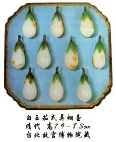 宫廷中当时大量的制造这种白玉鼻烟壶。也是十个一盒,有折方壶,有背壶式的,有茄式的,有籽玉的非常漂亮,美不胜收。我们看看茄式的鼻烟壶,像茄子,做得非常巧妙,它用碧玉做上茄上的蒂。有一个把,把一个盖打开 ,就是鼻烟匙,就是挖鼻烟的钓。