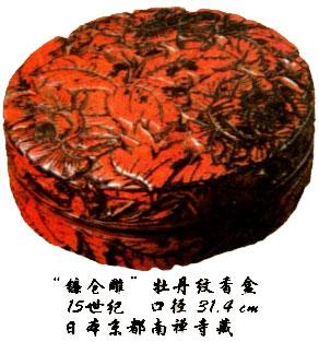 目前发现最早的剔红实物是在日本,而非中国。日本收藏有宋代的剔红,纹样非常浅。到目前为止,国内还没有宋代的剔红出土,甘肃出土的一个元代平头案是中国能够证明最早的剔红。