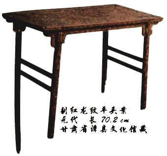 甘肃出土的元代剔红平头案,全身都剔出花卉纹样,跟明代晚期、清代早期的案子结构一模一样。只是由于年代久远,又埋藏在地下,它出土的时候比较松散,有的腿部局部腐烂,变得比较短,但大体模样跟后来的明式平头案没有本质上的区别。