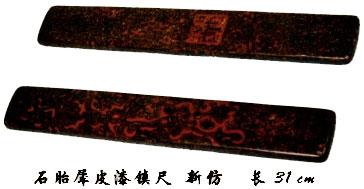 有一次,我看到一对犀皮漆的镇尺,后面有字:乾隆年制。镇尺做得漂亮、真实,第一眼我就被蒙住了,认为这就是真的,就是乾隆年间宫廷里使的,甚至是皇帝使用的犀皮漆镇尺。我们知道,镇尺一定要重,要不然在压纸的时候不能将纸压得很平。这个作伪的人非常清楚我们心里的想法,所以这对镇尺用的是石胎,很沉。漆器可能使用各种材料做胎,但使用石头做胎非常罕见。