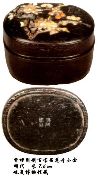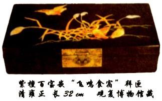 百宝嵌的品种中,有简有繁。我们能看到的大部分都嵌得比较繁,比较满,为什么呢?富丽堂皇,体现一种价值感。而嵌得比较少的作品,往往显得特别雅。比如我有一个紫檀百宝嵌拜匣,用的材料少,图案嵌得也不满。