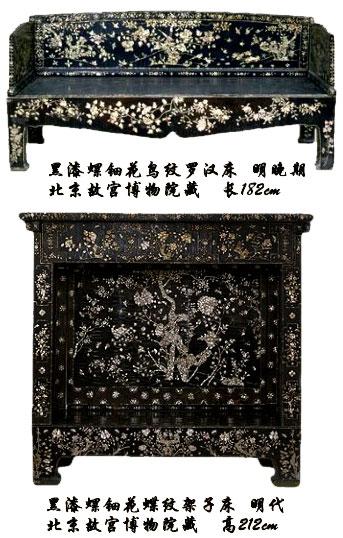 20世纪50年代的时候,故宫博物院从山西征集到两张黑漆嵌螺钿花鸟大床,一个罗汉床,一个架子床,至今还在故宫收藏。这两张床全部用厚螺钿镶嵌,所有螺钿都是白色的,图案粗枝大叶,反映出一种粗犷的美。由于螺钿的白色和床的黑漆形成反差,所以这件家具给人非常强烈的感受。这是山西特有的一种家具。