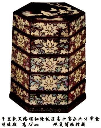 晚明时期,每个工艺领域里都有顶级人物。嵌螺钿工艺的顶级人物叫江千里,字秋水,浙江嘉兴人,生卒年没有记录,只知是晚明人。江千里制作的漆器后面写俩字"千里",就是他的名号。到了清代以后,江千里,尤其"千里"这两个字,就变成一个品牌。许多名贵的螺钿器皿上都嵌有"千里"两个字,但实际上并非江千里所做。我曾经从日本买回一件螺钿的六方套盒,底下嵌有"千里"两个字,典型的明代风格,更接近于江千里作品本身的面目。