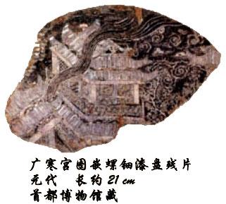 元代以后,螺钿的发现相对很少。1966年,北京元大都遗址出土过元代"广寒宫"黑漆螺钿盘残片,不大的一片,上面有残缺不全的一块图案。但这个残片非常重要,导致后来对一些螺钿艺术品重新定代。从这块残片上可以看到,它的工艺特征跟前后都不一样,跟唐宋不一样,跟明清也不一样。上面所有的图案都是用0.5毫米的螺钿小碎条拼接而成,这是一种极具特点的工艺。