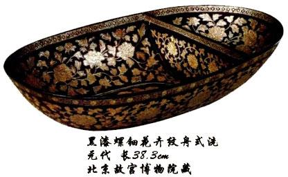 根据这块元代漆盘残片,我们再去看故宫的藏品。故宫藏有两件嵌螺钿舟形洗,也是用小碎条拼接的工艺,过去一直认为是明代晚期的作品。当这个元代残片出现以后,专家学者进行了对比,最终就把这两件故宫旧藏重新划为元代,定为国宝。那么这两件螺钿舟形洗是什么时候进入故宫的呢?没有记载,只有四个字:"清宫旧藏。"