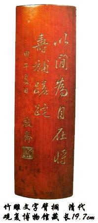 我有一个非常好的朋友,可能看我一天到晚忙忙叨叨,所以送给我一个臂搁。他自己也很喜欢这个臂搁,但送给了我。我一看臂搁上写的字,就知道他想跟我说什么。臂搁上写着 "以闲为自在,将寿补蹉跎"。刚给我的时候,我还不知道这句诗是哪儿来的,专门查了查,是唐朝诗人刘禹锡的《岁夜怀古》: