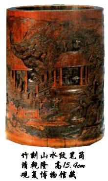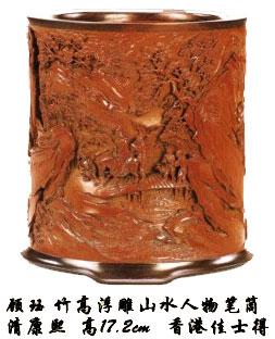 竹雕艺术品的第一高价是什么呢?一个竹雕笔筒。2005年,香港佳士得拍卖的康熙高浮雕山水人物纹笔筒,拍了1140多万元港币。能想象吗?一个经过中国文人设计创造的竹雕笔筒拍了1000多万元港币。拍卖的时候我在现场,大概到了500万元港币以上的阶段,所有举手竞争的人都是外国人,我就很奇怪。我原来认为外国人对中国的竹器不感兴趣,因为他们不能深刻地理解我们对竹子的那种情感。中国人对竹子有很深的感情,文学作品、绘画作品都告诉我们竹子的重要性。但恰恰是外国人不停地竞争,使这件竹雕笔筒攀上了千万元港币的高价。