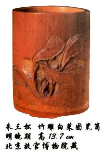 竹根雕里的典型作品有雕白菜、人物、动物;竹节雕里最典型的作品就是笔筒,我们能看到的大量竹笔筒都是利用竹节雕刻的。竹子的节与节之间都有隔,上下不通气。利用一个隔做底,恰恰可以做一个笔筒。笔筒的发明时间非常晚,大约到了明代晚期才出现,这跟我们的想象有很大差距。笔筒最早的雏形就是从竹子开始的。目前能找到的最早的实物笔筒都是竹雕;从文献里查到的关于笔筒的最早记载,也出自万历年间,依旧是竹雕。