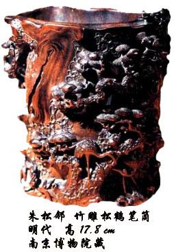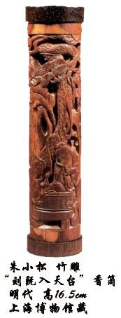 历史上的竹刻,大家首推晚明朱氏祖孙三代。朱氏祖孙是嘉定人,创立了竹刻的嘉定派。第一是朱鹤(朱松邻),著名作品是竹雕松鹤笔筒,现藏南京博物院;朱鹤的儿子朱缨(朱小松),作品有竹雕人物香筒,现藏上海博物馆;孙子朱稚征(朱三松),他的竹雕残荷洗现藏北京故宫博物院。