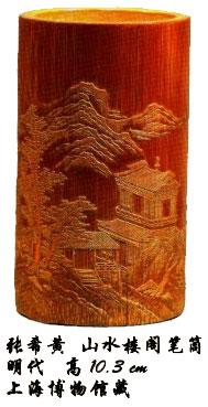 明末有一个刻竹高手叫张希黄,他发明了一种雕刻方法,叫留青雕。竹子刚被割下来时是青色的,留有一层青皮。雕刻时把不需要的地方轻轻刻去,以青皮部分来表现内容。用通俗的话讲,就是一种极浅的浅浮雕,这就是所谓留青雕。雕完以后,随着时间的流逝,青色会变成油黄色。所以我们看到的留青雕不是绿色的,而是黄色的。张希黄留青雕的典型代表作品是山水楼阁竹笔筒,现藏上海博物馆。