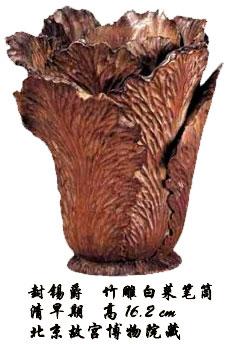 封锡爵没有进宫当差,一个人在老家待着,也是操刀不辍。他的代表作品是一棵竹根雕的白菜,非常写实,现藏北京故宫博物院。白菜是我国原产的蔬菜,过去称之为"蔬菜之王",就是所有的蔬菜都比不过白菜。白菜可以熬,可以炒,可以拌凉菜,可以炖汤,具备了所有蔬菜的特点。宋代人陆佃在《埤雅》中记载说:"菘性凌冬晚凋,四时常见,有松之操,故曰菘。今俗谓之白菜。"说明在宋代就叫它白菜了。但白菜是一个俗称,在古人的文献中它有两个名字:春天的白菜不叫白菜,叫"春菜";秋天的白菜也不叫白菜,叫"秋菘"。清代的《本草纲目拾遗》中也记载了白菜:"白菜汁甘温无毒,利肠胃,除胸烦,解酒渴,利大小便,和中止嗽。"并且说"冬汁尤佳"。它还能治点儿病:把白菜配上大葱、生姜、萝卜等煎汤饮用,还可以治感冒。